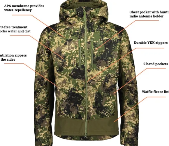 - Todella hiljainen ja erittäin hengittävä metsästystakki liikkuvaan jahtiin