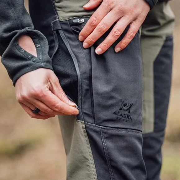 Monipuoliset ja kestävät Alaska Trekking Lite Pro -housut soveltuvat erinomaisesti niin vapaa-aikaan, metsästykseen, kalastukseen kuin vaellukseenkin. Housujen takamuksessa, polvissa ja lahkeissa on kestävät puuvillapolyesterivahvikkeet. Joustavat stretch-osiot takaavat optimaalisen liikkuvuuden ja istuvuuden. Kankaassa on vettä ja likaa hylkivä PFC-vapaa käsittely, reisien sivuilla ventilaatiovetoketjut sekä lahkeissa nepparikiristys. Reisitaskuissa on vetoketjut, ja toisessa taskussa on erillinen puhelintasku. Myös takataskussa on vetoketju.