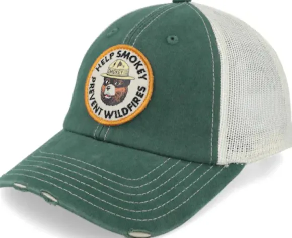 Sivuilla ja takana on hengittävät mesh-paneelit hyvän ilmanvaihdon takaamiseksi. Takaa löytyy säädettävä muovinen kiristysremmi optimaalista istuvuutta varten. Etuosassa on brodeerattu Smokey Bear -merkki vintagehenkisellä designilla.