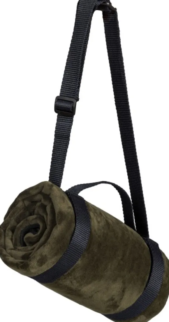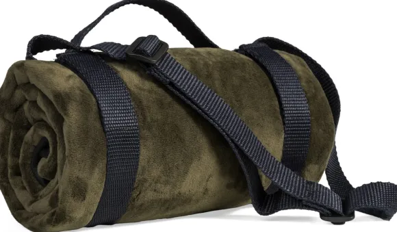 Huovan pinta on peitetty pehmeällä, paksulla velourilla syvässä oliivinvihreässä sävyssä, kun taas taustapuoli on kestävää ja vedenpitävää materiaalia. Sivutaskussa on paikka valitsemallesi varavirtalähteelle.