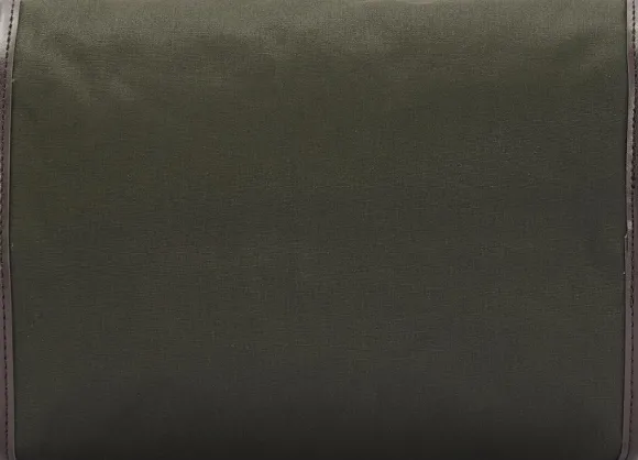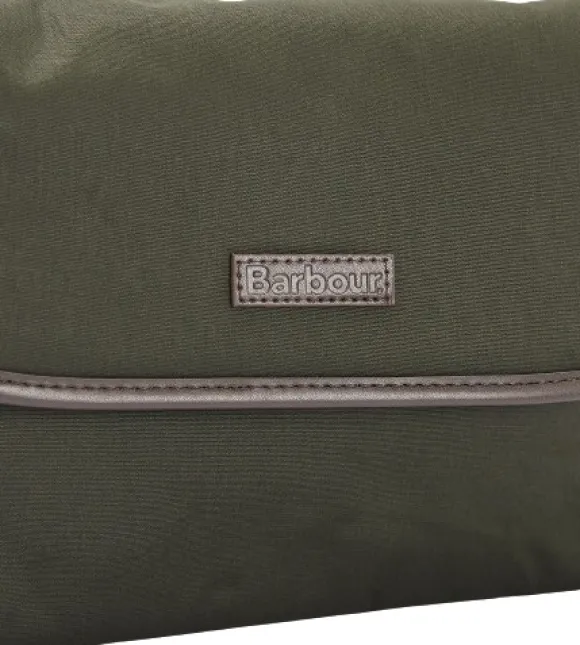 Kaksinkertaisella kiinnikkeellä varustettu etuläppä taittuu helposti ylös ja tarjoaa useita sisätaskuja hygieniatarvikkeille sekä ripustuskoukun. Barbour-kuvioitu PU-merkki edessä.
