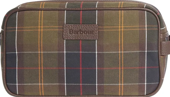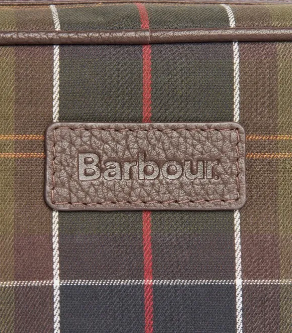 Barbourin Tartan Washbag on toilettilaukku, jossa on klassinen tartan-kuvio. Laukku suljetaan vetoketjulla ja siinä on ylimääräinen tasku ulkopuolella. Siinä on yksityiskohtia synteettisestä nahasta ja sivussa kantokahva.