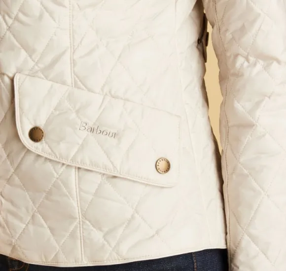Barbour W's Flyweight Cavalry quilt on timanttitikattu takki jossa on säädettävä selkäosa. Takissa on sekä vetoketju että napit, ja napilliset taskut edessä.