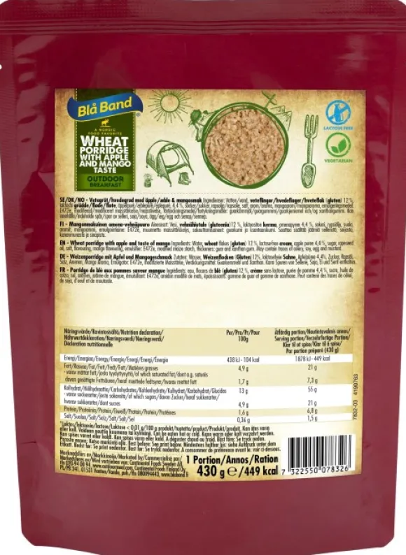 Blå Bandin mangon ja omenan makuinen vehnäpuuro on heti valmis syötäväksi, ja sen voi halutessaan myös lämmittää. Blå Band Outdoor Meal on kehitetty alun perin armeijalle ja heidän kenttätarpeisiinsa, mutta korkean ravintoarvon ja hyvän makunsa ansiosta Blå Bandin retkiruoat soveltuvat hyvin aktiivisille ulkoilmaihmisille. Ruoka on kätevästi ja helposti käytettävässä pakkausmuodossa.