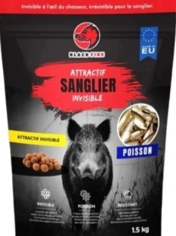 Black Fire Invisible on täysin uudenlainen syötti, joka koostuu pienistä rakeista, jotka ripottelet ja peität kevyesti maanpinnan alle. Näin villisian täytyy kaivaa syötti esiin, mikä pitää sen pidempään ruokintapaikalla.