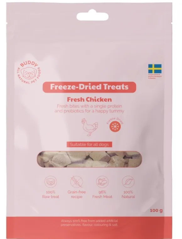 Anna koirallesi makuelämys Freeze Dried Snack Raw -kananmakuisten herkkujen avulla. Nämä pakastetut herkut Buddyltä on valmistettu jopa 96 % tuoreesta lihasta.