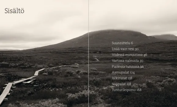 Reseptit on jaoteltu niiden valmistamiseen kuluvan ajan mukaan: joihinkin tarvitsee lisätä vain kiehuvaa vettä, jotkut valmistuvat viidessä tai viidessätoista minuutissa, loput vaativat puolen tunnin valmistusajan. Lisäksi kirja neuvoo välipaloista ja jälkiruoista sekä leivonnasta vaellusoloissa.