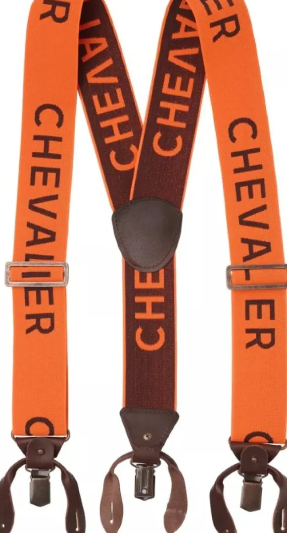 Chevalierin joustavat, leveät henkselit, joissa on sekä klipsi- että nappikiinnitys. Tyylikkäät, nahkaiset yksityiskohdat. Henkselit ovat säädettävät. Kaksi väriä: oranssi ja ruskea.