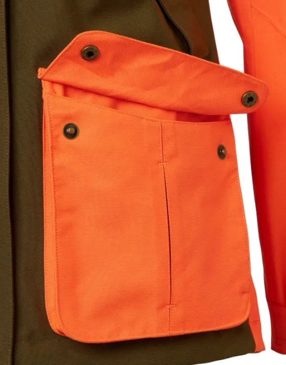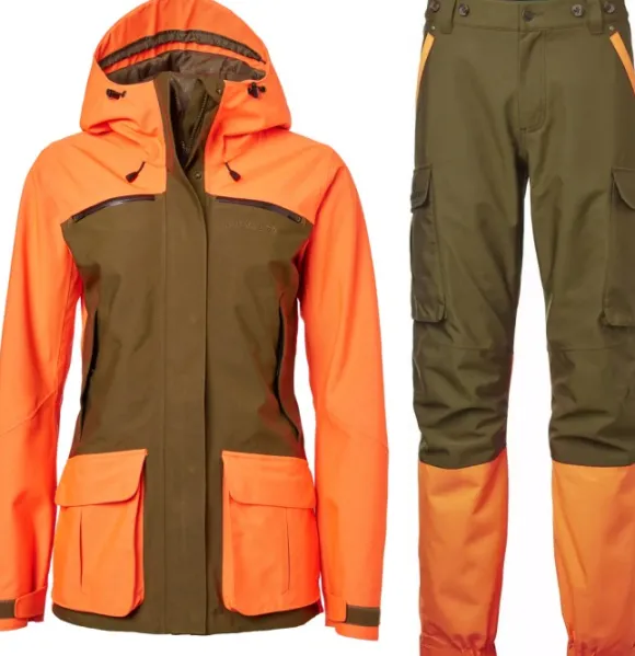 Huomiovärinen jahtipuku, joka palvelee varmasti vuodesta ja vuodenajasta toiseen. Lujan päällikankaan alla hengittävä ja vedenpitävä Chevalite-kalvo pitää käyttäjän kuivana, ja hengittävyyttä voi halutessaan tehostaa kainaloiden tuuletusvetoketjut avaamalla. Taskuja on runsaasti, kuten läppäsulkuiset reisitaskut, kaksi radiotaskua, povitaskut ja fleecevuoratut käsienlämmittelytaskut. Takin päävetoketju aukeaa näppärästi kahteen suuntaan. Runsaat säätömahdollisuudet niin takissa kuin housuissakin.