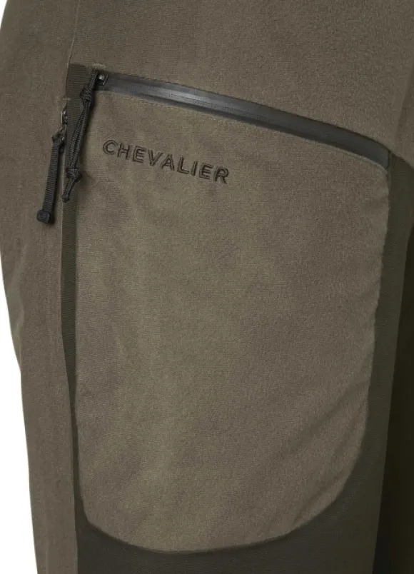 Housut ovat veden- ja tuulenpitävät Chevalierin oman Chevalite-kalvon ansiosta ja kaikki saumat on teipattu. Housuissa on vahvikekangas lahkeensuissa ja niissä on korkeammaksi muotoiltu vyötärönauha, joka estää housuja liukumasta alaspäin istuessa tai kulkiessa haastavassa maastossa.