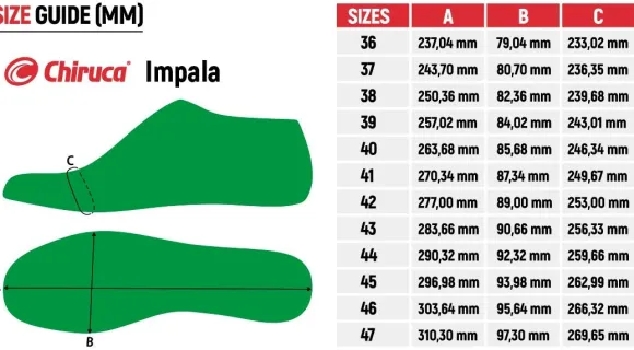 Chiruca Impala on kestävä unisex-mallin kenkä, jossa on normaali lesti. Se sopii loistavasti käytettäväksi poluilla ja kivisessä maastossa.