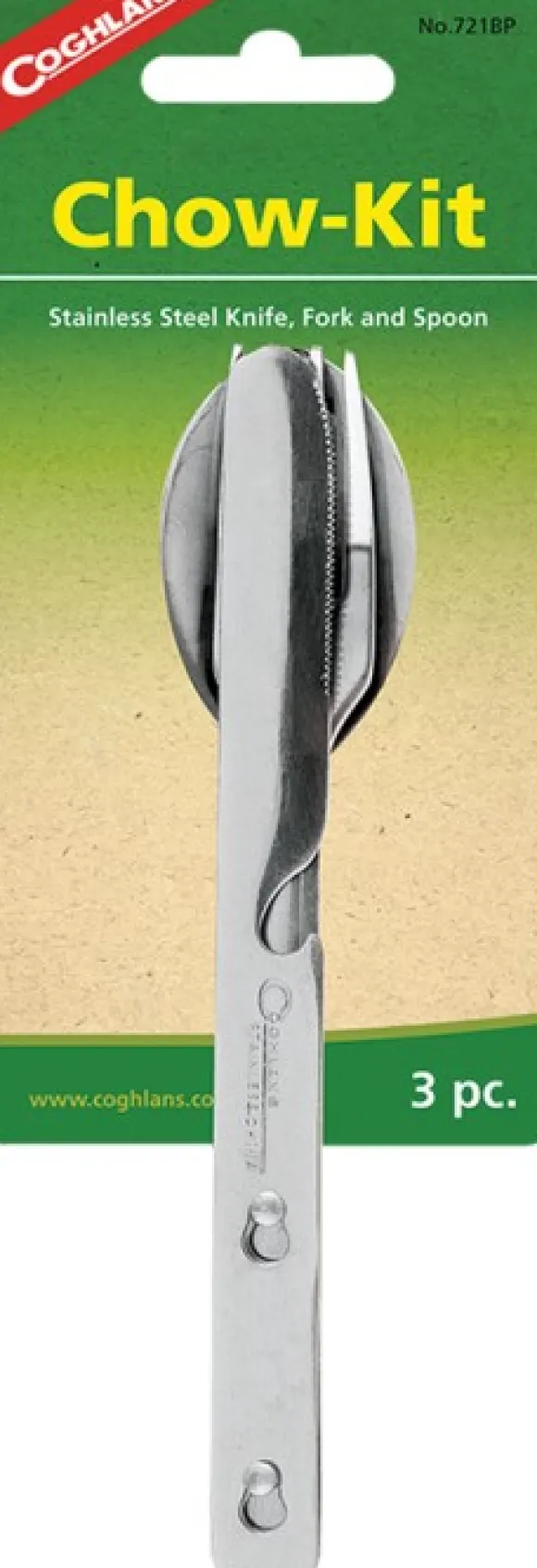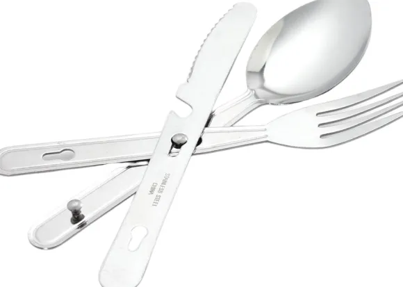 Coghlan’sin aterinsettiin kuuluu ruostumattomasta teräksestä valmistettu lusikka, haarukka ja veitsi. Aterimet on helppo kiinnittää toisiinsa säilytyksen ajaksi, ja ne vievät vain vähän tilaa repusta tai rinkasta.