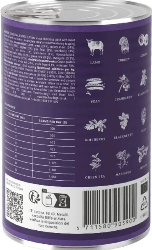 ESSENTIAL FOODS Estate Living Pâté on herkullinen paté, jossa on lampaan- ja kalkkunanlihapaloja aikuisille koirille. ESSENTIAL FOODSIN ainoa lampaanlihaa sisältävä paté on jotain aivan erityistä! Voidaan tarjoilla täysravintona tai herkullisena lisukkeena.