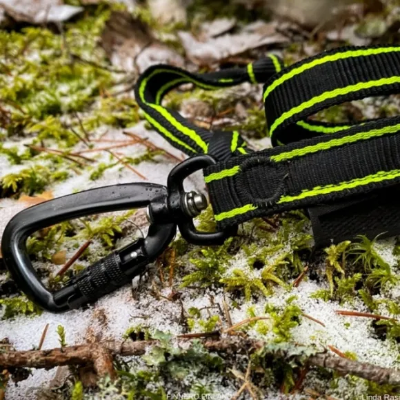 Tämä koiran talutushihna on varustettu kevyellä ja mukavalla karbinlukolla, jolla se on helppo kiinnittää koiran kaulapantaan tai valjaisiin. Vahva karbiini on varustettu turvallisella lukitusmekanismilla ja kestää 400 kg:n rasituksen.