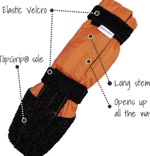 FinNero SULO on pitkävartinen suojakenkä, joka suojaa koiran tassuja muun muassa mudalta, lialta ja lumikerrostumilta.