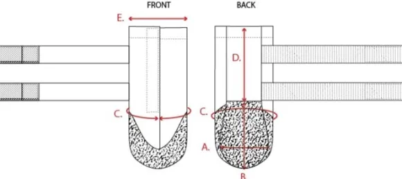 Koko / A = tassun leveys / B = tassun pituus / C = ympärysmitta / D = pohjan sauman korkeus yläreunaan / E = suljetun tarranauhan ympärysmitta: