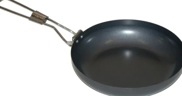 Teräksinen paistinpannu nuotiolle. Pannun halkaisija on 24 cm ja siinä on taitettava kahva.