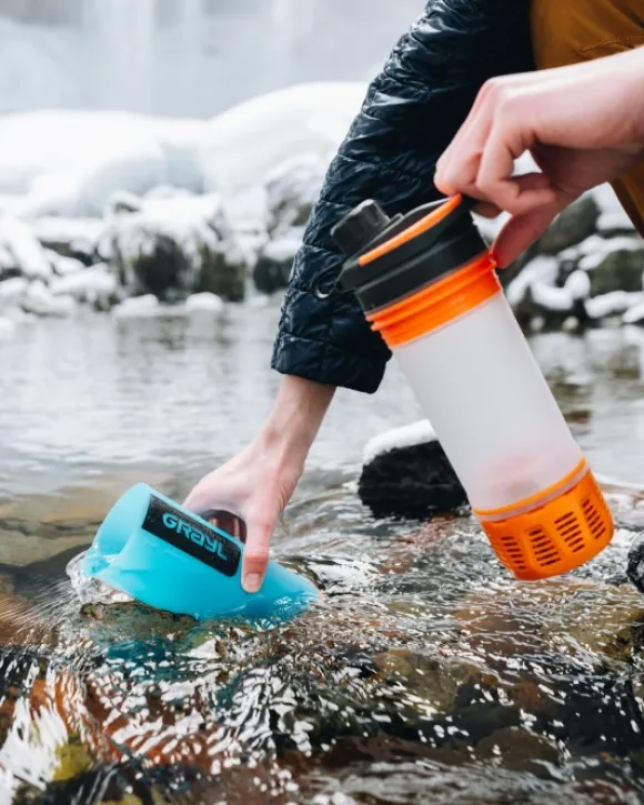 Graylin Geopress™ Purifier on pullo, joka puhdistaa ja suodattaa vettä. Pullo puhdistaa veden vedessä leviävistä taudinaiheuttajista (kuten viruksista ja bakteereista) ja suodattaa pois hiukkaset, kuten sedimentin ja mikromuovin. Harvat vettä puhdistavat pullot voivat kilpailla GeoPressin nopeuden, yksinkertaisuuden ja tehokkuuden kanssa! Vain kahdeksassa sekunnissa se puhdistaa ja suodattaa 710 ml vettä.