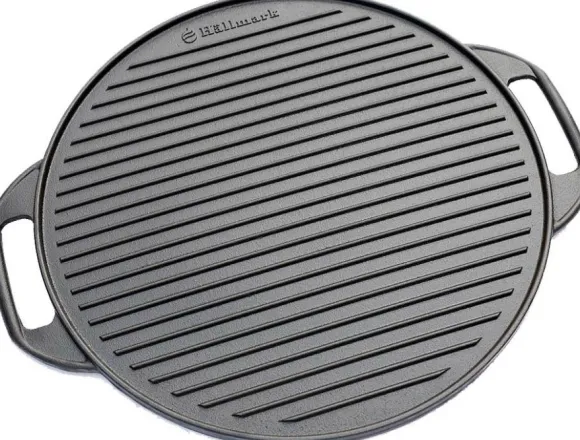 Hällmark Cast Iron Grill Pan on kaksipuolinen grillipannu, jonka toisella puolella on sileä pinta paistamiseen ja toisella puolella uurrettu pinta grillaamiseen. Grillipannu on valmistettu valuraudasta, ja se sopii erinomaisesti Hällmarkin 30 cm tai 40 cm kaasukeittimelle.