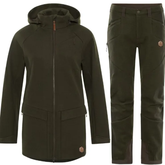 NAISTEN METSÄSTYSPAKETTI, JOHON KUULUU METSÄSTYSTAKKI HILJAISESTA VILLASEKOITTEESTA SEKÄ YHTEENSOPIVAT METSÄSTYSHOUSUT HÄRKILALTA