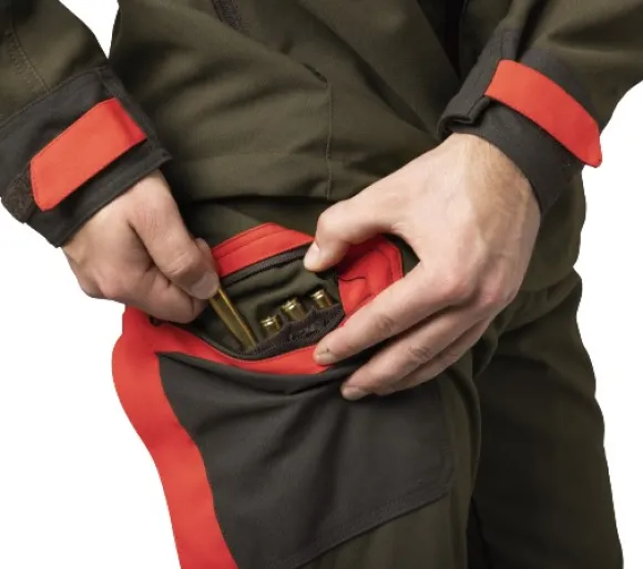 Reisitaskut on varustettu vetoketjuilla, ja oikeassa taskussa on myös patruunatasku. Vasemman reisitaskun kohdalla on tarrakiinnitys, ja molempien reisitaskujen takana on käytännölliset ilmanvaihtovetoketjut.