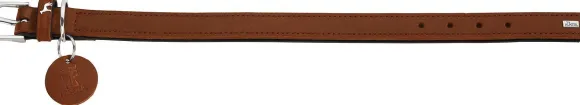 Tyylikäs kaulapanta härännahasta metallisella soljella sekä irrotettavalla härännahkaisella avainrenkaalla.
