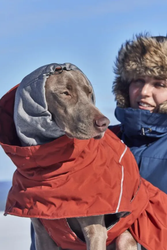 Lämpötakki suojaa koirasi turkkia hyvin ja estää tuulenpuuskia – vähän kuin supersankarin asu, kun taas pehmeä ja korkea trikoo-huppu suojaa ja lämmittää koiran niskaa ja korvia.