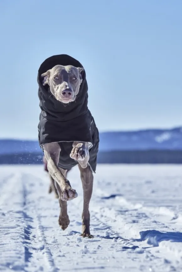 Lämpötakki suojaa koirasi turkkia hyvin ja estää tuulenpuuskia – vähän kuin supersankarin asu, kun taas pehmeä ja korkea trikoo-huppu suojaa ja lämmittää koiran niskaa ja korvia.