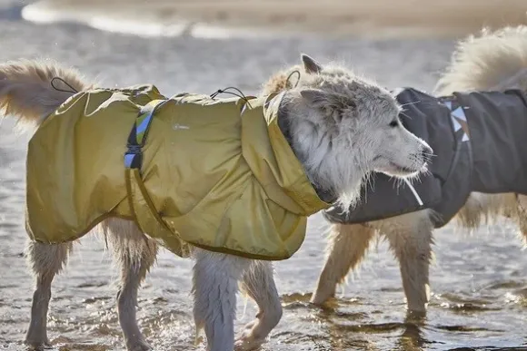Taluttimen kiinnitys voidaan sulkea estämään veden valumista koiran selkään, ja lisäksi Mudventure-takissa on vedenpitävä sadesuojakaulus – se voidaan kiristää korvien takaa estämään veden valumista koiran kaulaan.