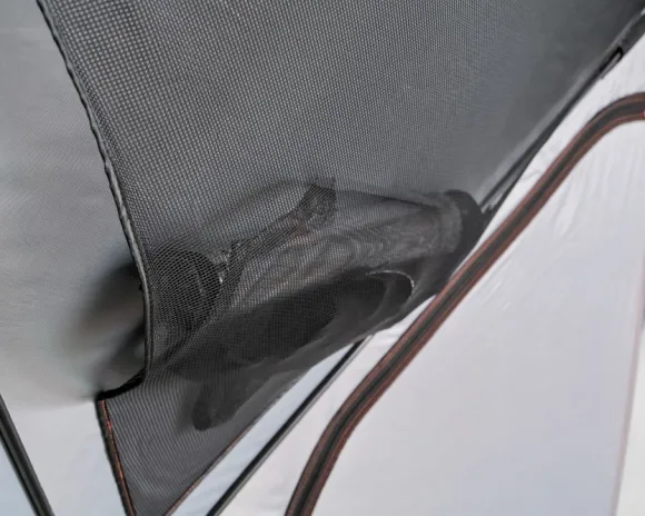Teltassa on tilava 7,3 m² lattia-ala, joka tarjoaa runsaasti tilaa varusteille ja pakkauksille. Vaaleanharmaa sisäosa luo kirkkaamman ympäristön, kun ikkunat on peitetty, mutta mahdollistaa myös riittävän pimeyden haluttaessa.