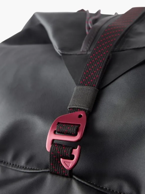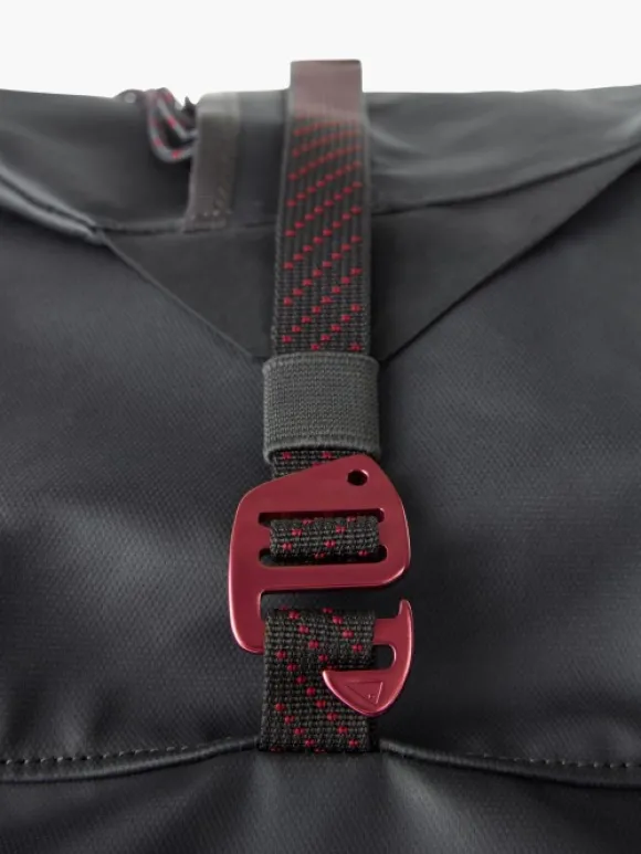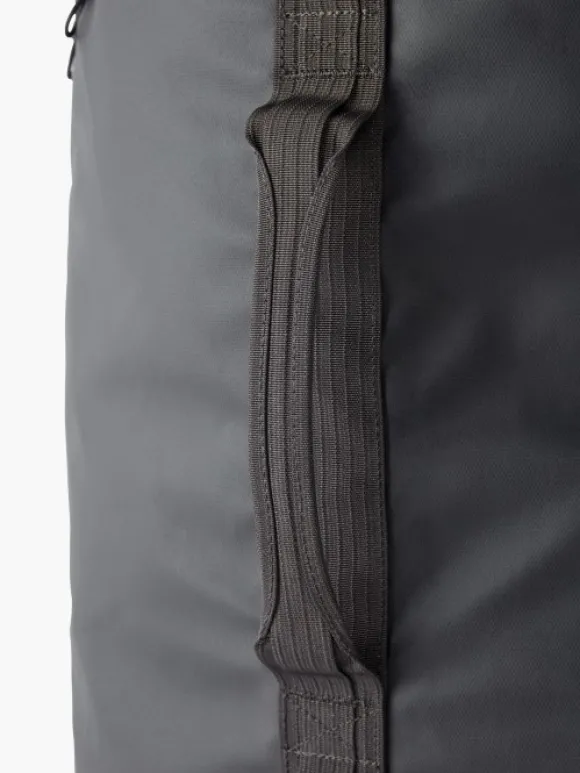 Klättermusen Ydalir laukku vedenpitävästä kankaasta. Laukku on todella kestävä Cordura Ecomade-vahvistusten ansiosta. Laukussa on kantokahvat molemmilla sivuilla sekä vakaa kantokahva yhdellä kädellä kantamiseen. Laukussa on myös pehmustetut ja irrotettavat olkahihnat, jotta laukkua voi käytää reppuna. Laukussa on pitkä, suora vetoketju, joka jatkuu toiselle sivulle, mikä helpottaa pakkaamista ja purkamista. Useita kiinnityspisteitä laukun ulkopuolella tarvikkeille ja lisäosille. Sivuilla olevien kantokahvojen vieressä on lenkit, joiden avulla laukun saa viritettyä remmillä auton tai vastaavan katolle. Laukun saa myös pakattua pienempään tilaan.