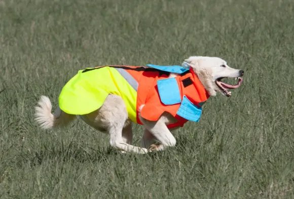 Jos saavut paikalle ja et näe eläintä, mikä on tavallista, voit silti helposti nähdä, mihin suuntaan koira on kääntynyt, jopa tiheässä maastossa, koska liivi on kolmivärinen. Liivissä on myös heijastimet, jotka takaavat näkyvyyden kaikista kulmista.