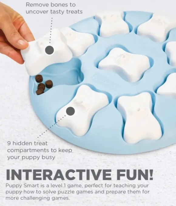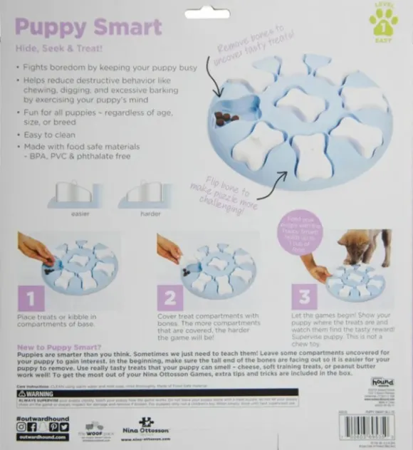 Puppy Smart Nina Ottossonilta on interaktiivinen aktivointilelu pennullesi. Se on suunniteltu stimuloimaan koirasi mieltä ja ehkäisemään tylsistymistä. Tason 1 palapelilelu on ihanteellinen pienille aloittelijoille, ja se auttaa pentua kehittämään ongelmanratkaisukykyään.