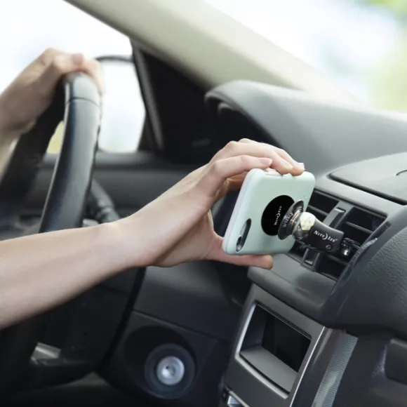 Magneettinen puhelinpidike, joka kiinnittyy auton tuuletuskanavan säleikköön. Magnetistimin ansiosta puhelin on helppo irrottaa ja kiinnittää, ja sen asentoa voi pidikkeessä säätää.