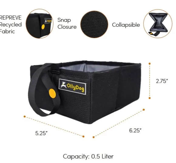 Kierrätysmateriaaleista valmistettu kokoontaitettava koiranruokakuppi. Helppo ottaa mukaan reissuun.