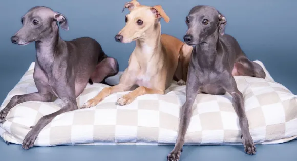 Paksusta ja kestävästä verhoilukankaasta valmistettu koiranpatja, jossa hieno ruutukuvio