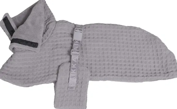 Pyyhkeessä on kaksi kerrosta mikrokuitua, korkea kaulus ja matala selkäosa helppoa kuivaamista varten kylvyn jälkeen.