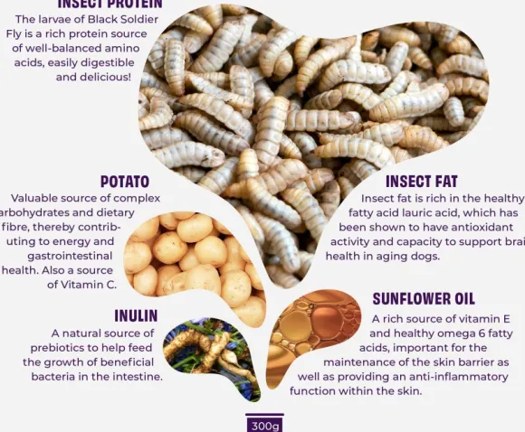 TÄYDELLINEN JA TASAPAINOINEN MÄRKÄRUOKA AIKUISILLE KOIRILLE KAIKISTA RODUISTA JA KOKOLUOKISTA – HYÖNTEISET AINOANA ELÄINPROTEIININA