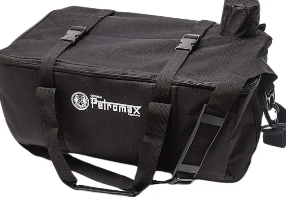 Kompakti laukku Petromaxin Loki Camping Stove and Tent Ovenille. Päälläolevien solkien avulla laukkuun voi kiinnittää lisävarusteita. Kangas on korkealaatuista ripstop-kangasta, kahvat ovat irroitettavissa ja olkain on säädettävissä.