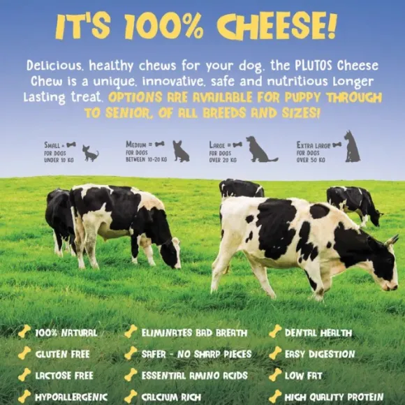 Plutosin juustolla ja naudanlihalla maustettu koiranpuruluu on 100 % luonnollinen ja valmistettu korkealaatuisesta maitoproteiinista (kaseiini), joka on laktoositon ja rasvaton.
