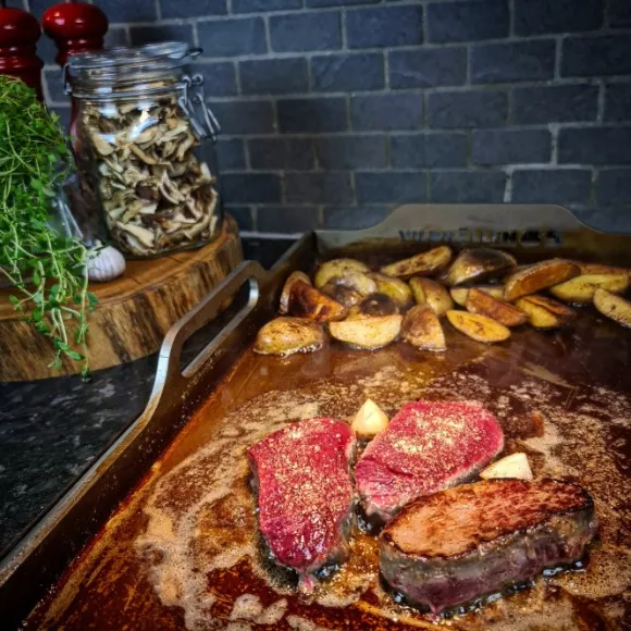 Ruotsalaisen Royal Steelin Vildhällen 45 on suorakulmainen paistolevy, joka on suunniteltu muuttamaan puolet liesitasostasi upeaksi paistopöydäksi. Mutta se toimii myös grillissä tai avotulella.