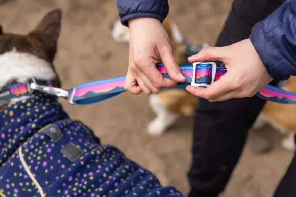 Taluttimessa on käytännölliset ominaisuudet, kuten pehmustettu kädensija, lisälenkki koirankakkapusseille tai pienille kiinnitettäville tarvikkeille, sekä vahva hihnan materiaali, joka säilyttää värinsä.