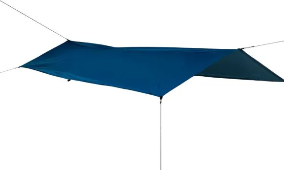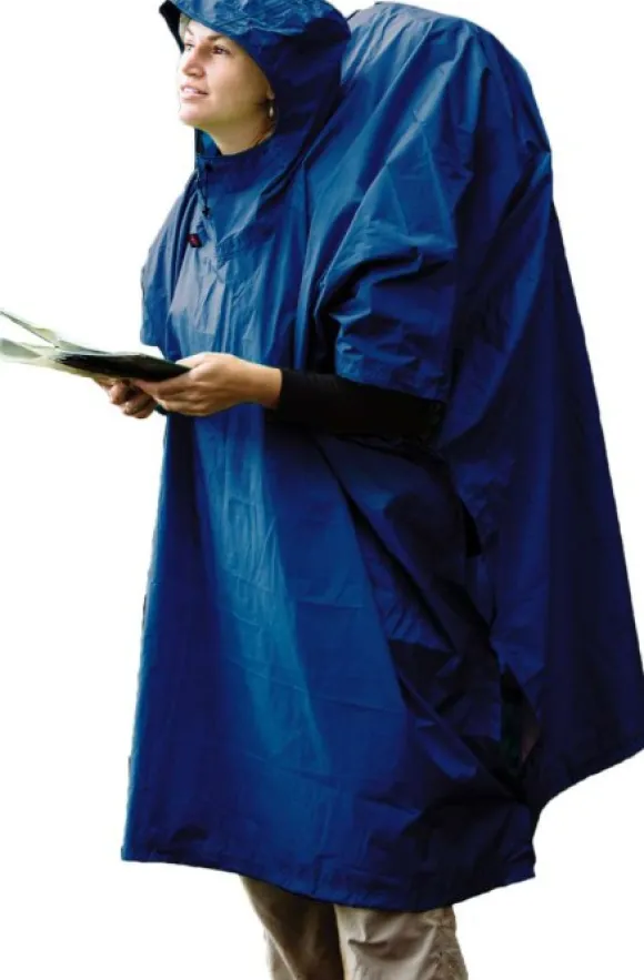 Sininen Sea to Summit -sadeponcho on reilun kokoiseksi mitoitettu sadetakki, jonka voi pukea päällensä riisumatta rinkkaa selästään. Näin rinkkaa ei tarvitse suojata omalla sadesuojallaan, vaan sekä rinkka että rinkan kantaja pysyvät kuivina ponchon alla.
