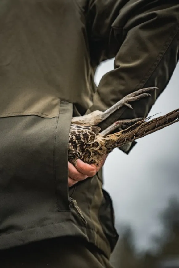 Vedenpitävä takki on varustettu irrotettavalla ja säädettävällä hupulla, vedenkestävillä taskuilla ja riistavarastolla – täydellinen ajometsästykseen. Takissa on myös kosteusvaikutuksia estävä vuori ja säädettävä helma, joka takaa mukavuuden ja kestävyuden.