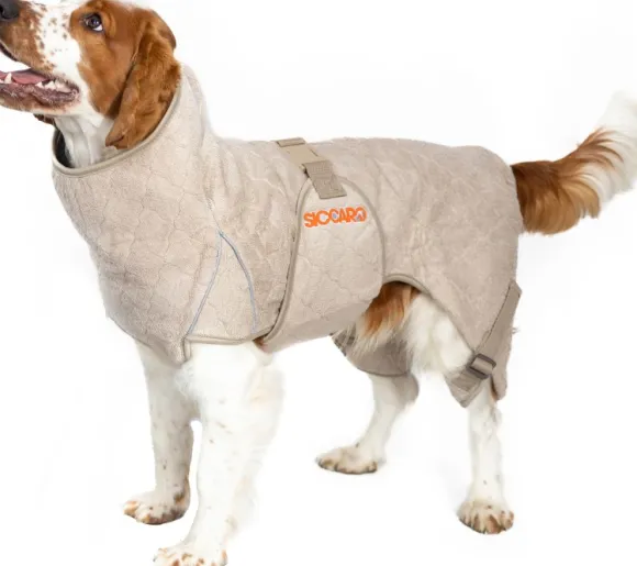 Siccaron Solution Drying Robe on erittäin imukykyinen ja ergonomisesti muotoiltu kuivausloimi koirille. Solution-kuivausloimi on muotoiltu uudelleen asiakkaiden toiveiden ja palautteen perusteella. Uusi malli on 20 % peittävämpi kuin edeltäjänsä, joten se peittää hyvin myös koiran takaraajat. Erityisen hyvin tämä loimi sopii esimerkiksi kultaisillenoutajille, spanieleille ja settereille, mutta yhtä hyvin se käy myös muille koiraroduille. Ergonomisesti istuvassa loimen saumoissa on heijastavaa lankaa, joka parantaa näkyvyyttä pimeällä. Lisäksi loimessa on uudet optimoidut hakaset sekä kestävät, luistamattomat soljet. Kaulassa on aukko talutushihnalle.
