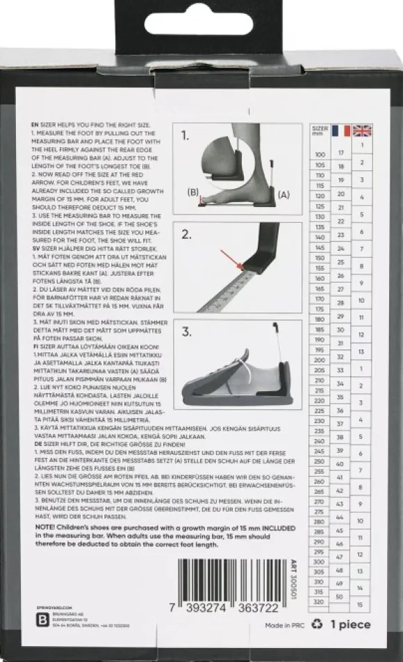 Sizerilla voit mitata sekä jalkasi että kenkien sisämitan millimetreissä. Lasten jalkoihin sisältyy niin sanottu kasvuvara, joka on 15 mm. Aikuisille jaloille vähennä 15 mm.