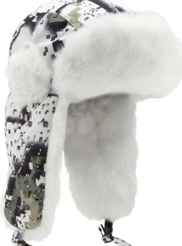 Lämmin karvalakki, joka on vuorattu sisältä pehmeällä ja lämpimällä keinoturkiksella. Ulkopuoli valkoisessa Desolve Zero -lumicamokuosissa. Läpissä kiinnityshihna, jolla läpät saa liitettyä yhteen leuan alla tai päälaella, jos haluaa läppien pysyvän ylhäällä. Materiaali kauttaaltaan polyesteriä.