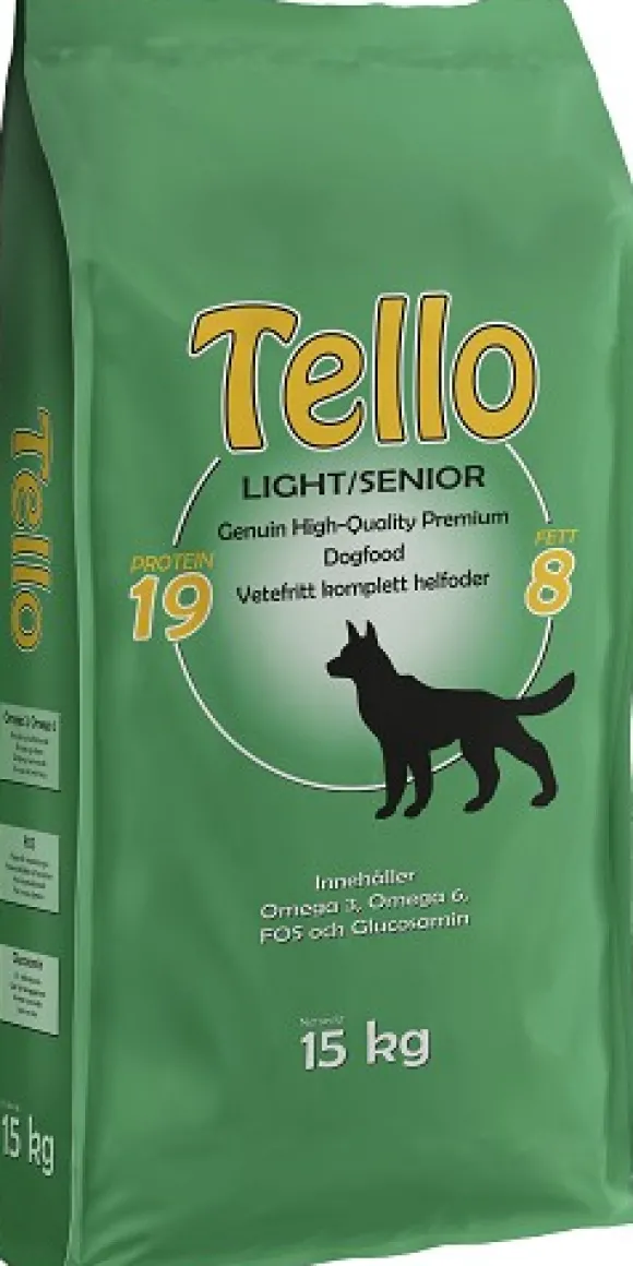 Tello Light/Senior on vehnätön täysrehu kaikenrotuisille koirille, joiden aktiivisuustaso on normaali tai matala. Sisältää lihaproteiinina kanaa ja lohta ja on hellävaraista koirasi vatsalle. Suositellaan vanhemmille ja kastroiduille koirille. Suosittu Light -rehu, jota käytetään ylipainoisille koirille (ylipainoisen koiran ollessa kyseessä vähennä suositellusta päiväannoksesta noin 10-20 %).