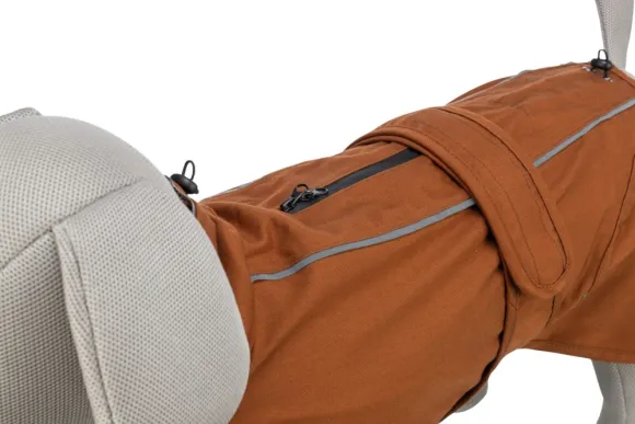 Tämä tilava sadetakki auttaa nelijalkaista ystävääsi pysymään lämpimänä viileinä päivinä samalla, kun ulkokerros pitää koiran kuivana. Sadetakki on tuulenpitävä ja vettä hylkivä, ja siinä on ylimääräisen korkea kaulus, joka on säädettävissä kiristysnyörillä. Kaksi vetoketjua niskan kohdalla mahdollistavat hihnan kiinnittämisen tai takin yhdistämisen valjaisiin.