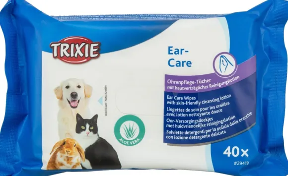 Trixie Korvapyhkeet koirille, kissoille ja muille pieneläimille. Sisältää ihoystävällisen puhdistusnesteen, jossa on Aloe Veraa ja taikapähkinää. Sopii erinomaisesti säännölliseen hoitoon ja korvien hygieeniseen puhdistukseen.